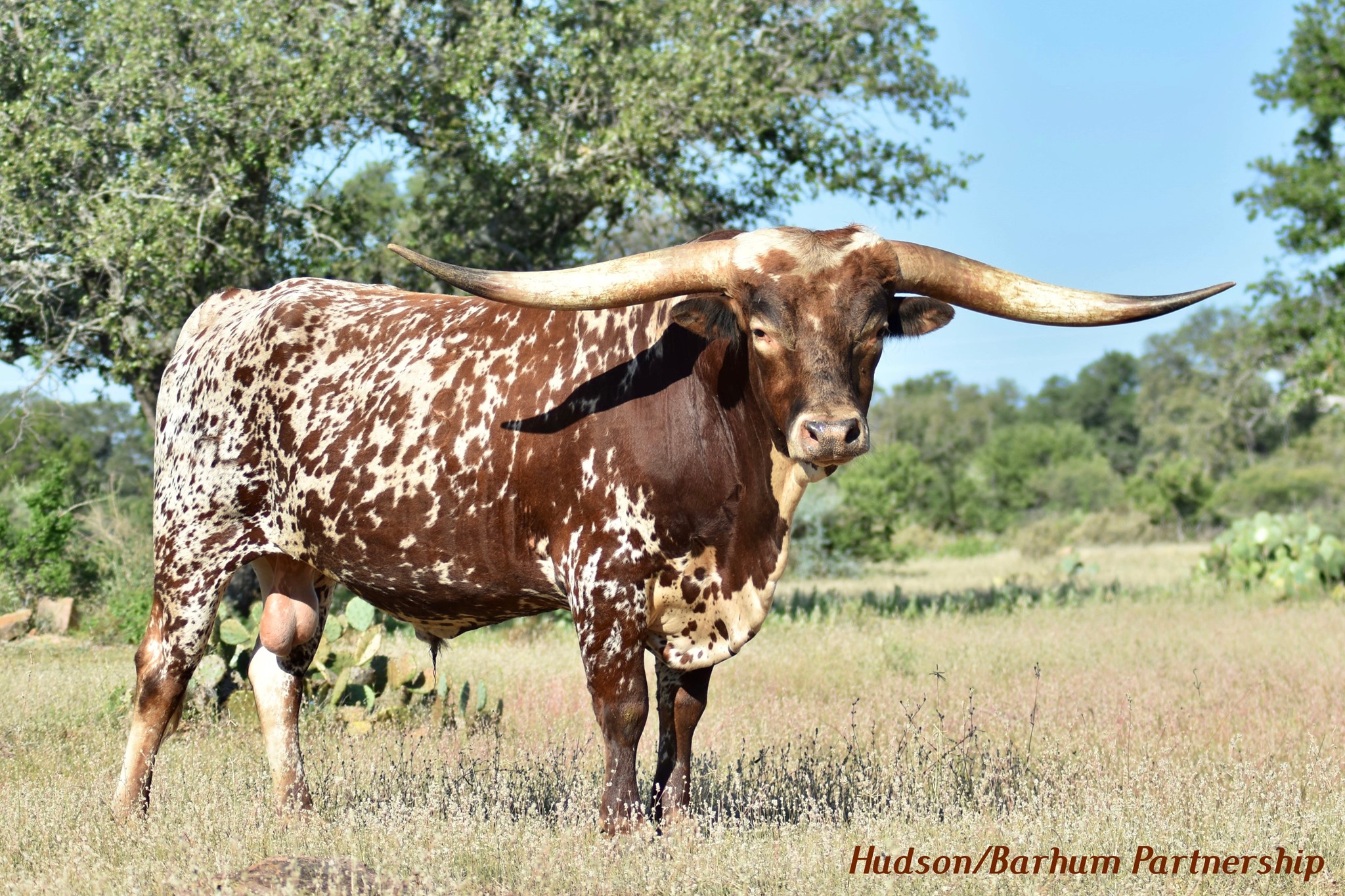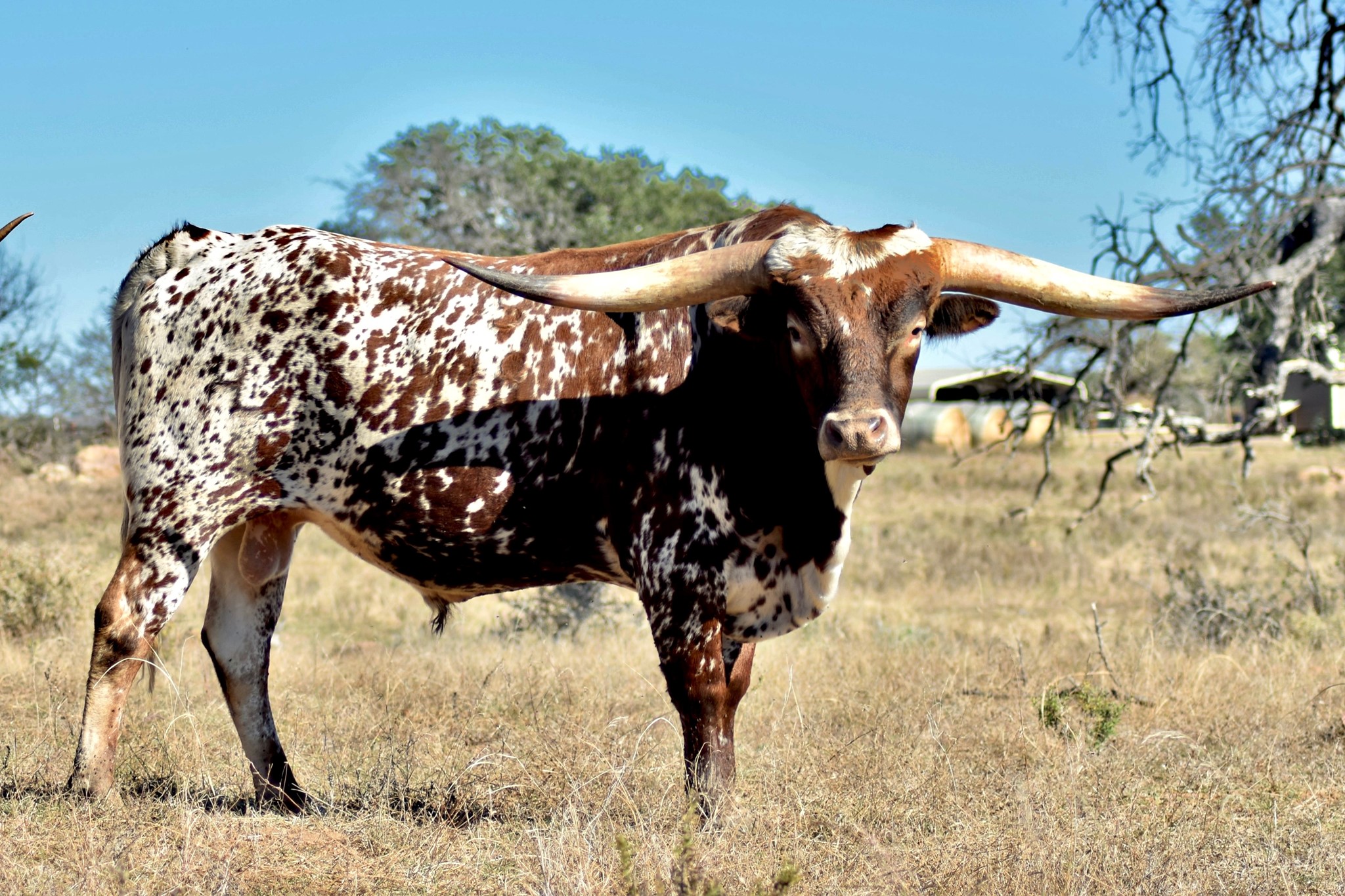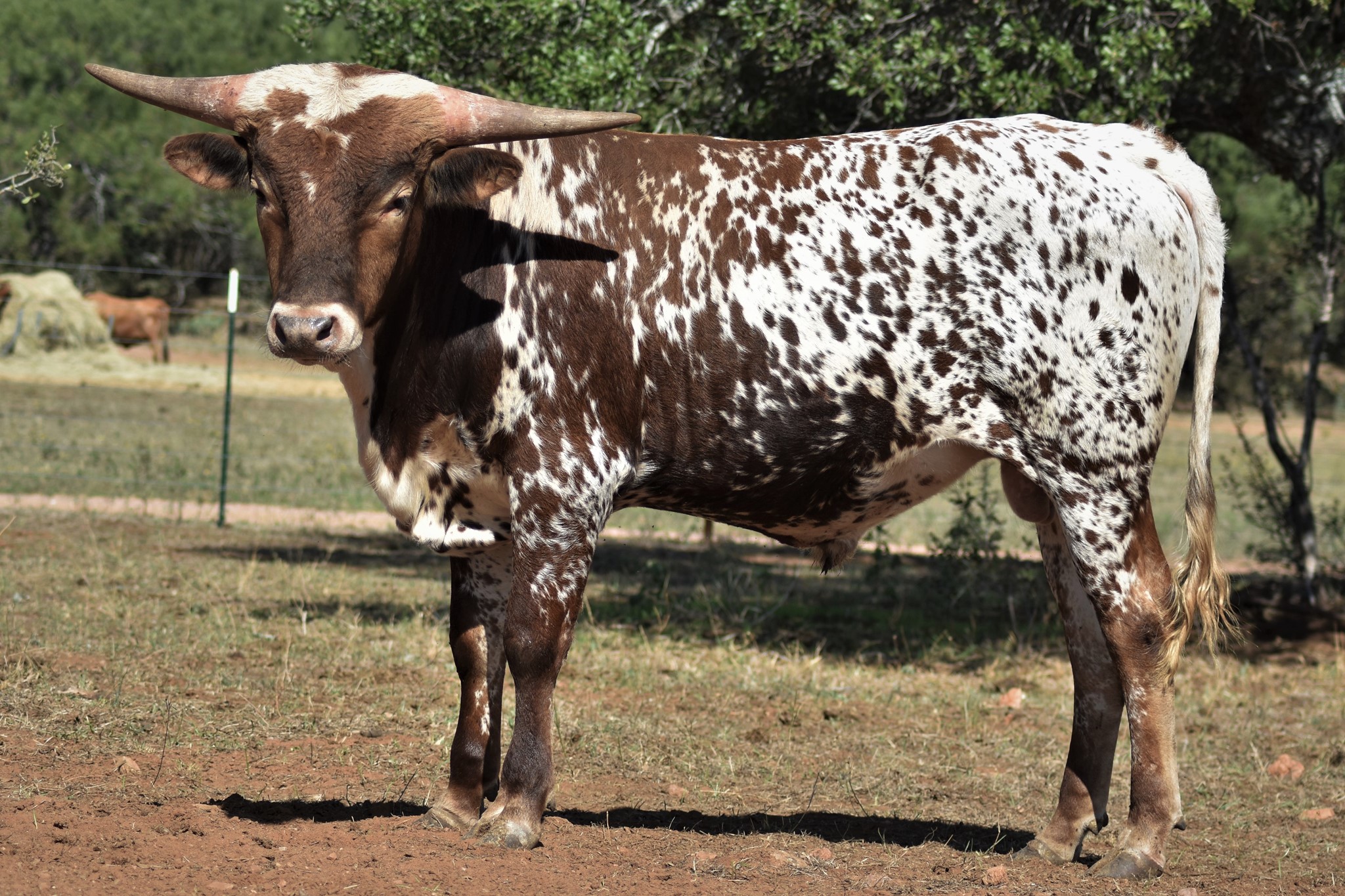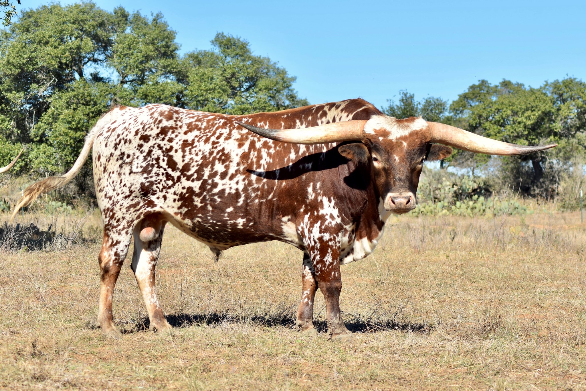A wonderful cross of two amazing Longhorns, FIFTY-FIFTY BCB x 95.25"TTT D/O MISS GRANDE. Maternal brother to the exceptional aver 100"TTT Helm Miss Impressive that sold for $160,000 at the 2023 HV Fort Worth Sale. Beautifully marked with great color, built like a tank with perfect conformation, has an amazing disposition, and his offspring speaks for itself just look at his progeny.