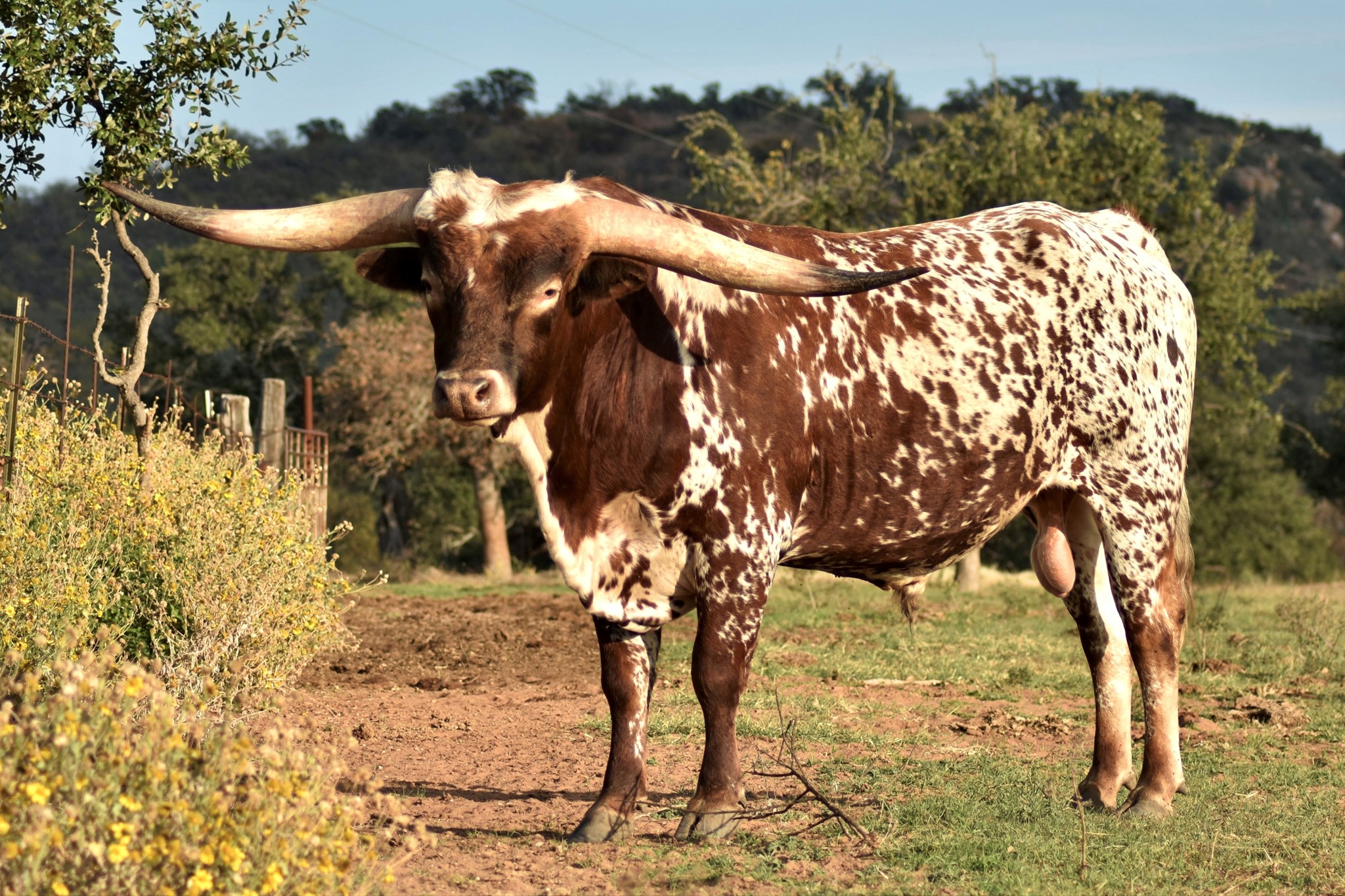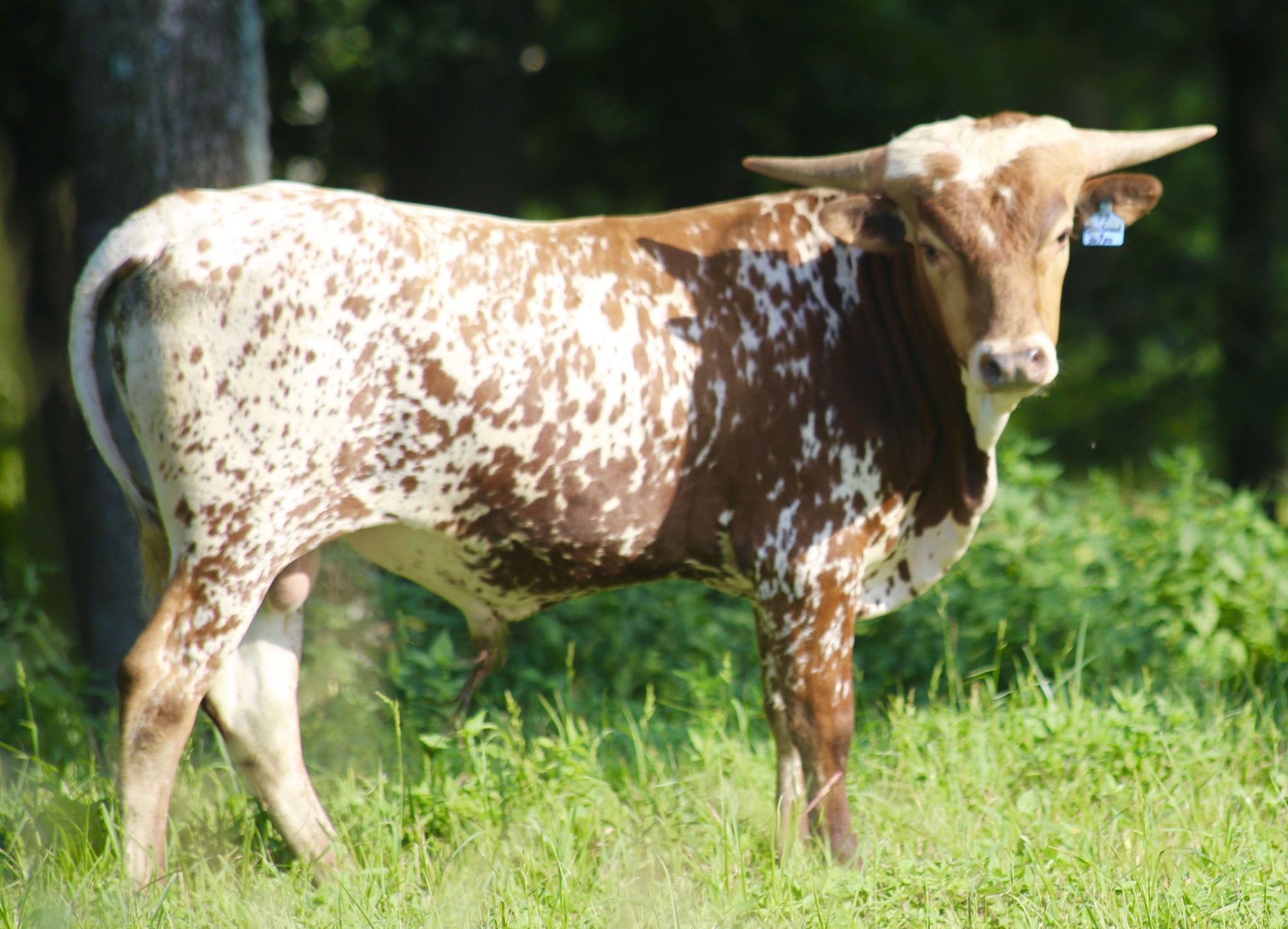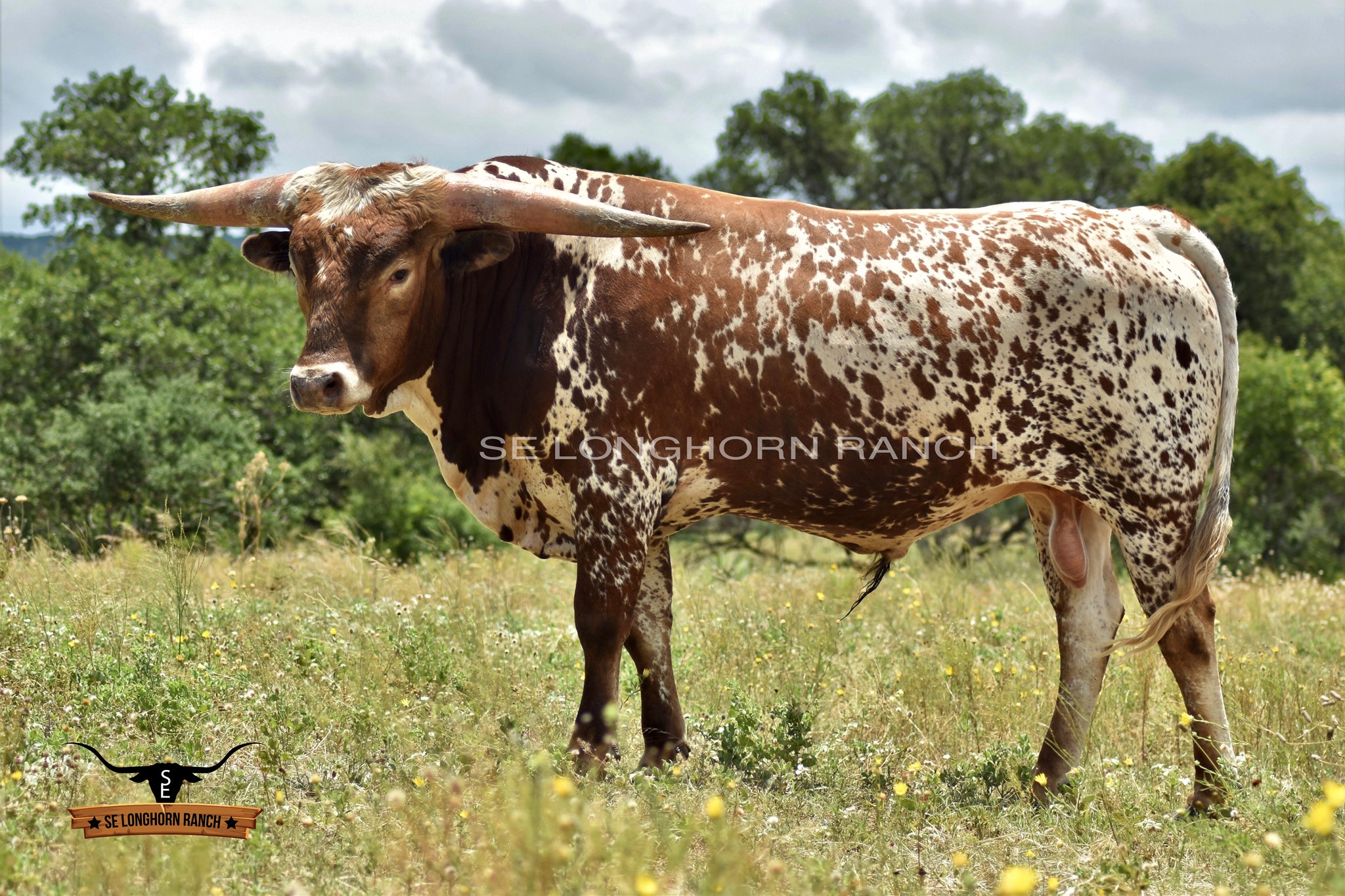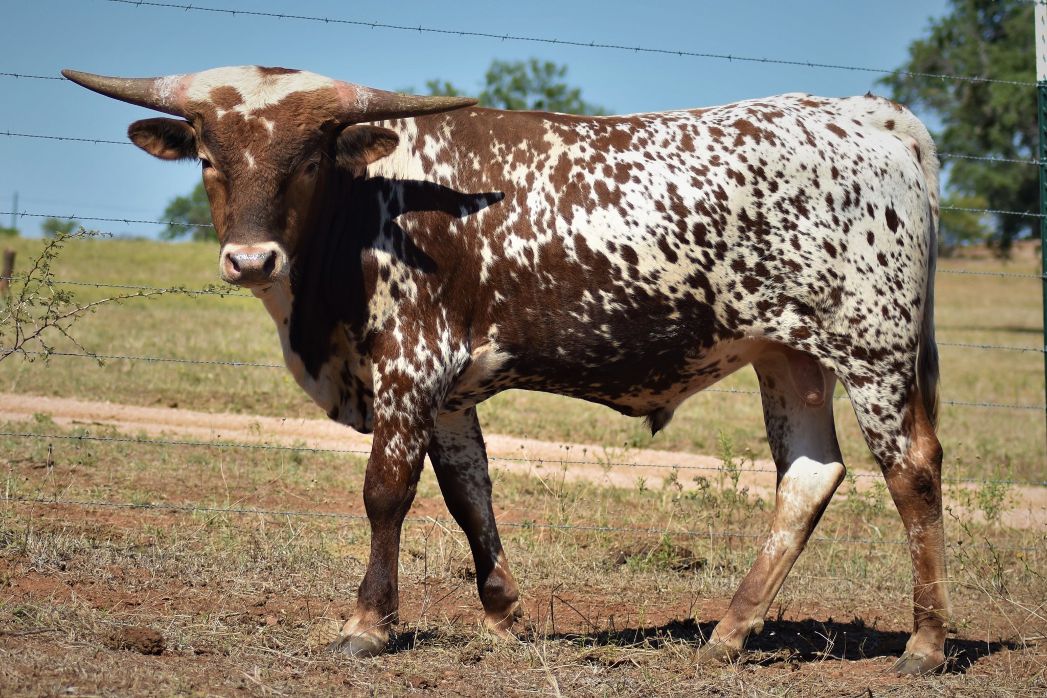 A wonderful cross of two amazing Longhorns, FIFTY-FIFTY BCB x 95.25"TTT D/O MISS GRANDE. Maternal brother to the exceptional aver 100"TTT Helm Miss Impressive that sold for $160,000 at the 2023 HV Fort Worth Sale. Beautifully marked with great color, built like a tank with perfect conformation, has an amazing disposition, and his offspring speaks for itself just look at his progeny.