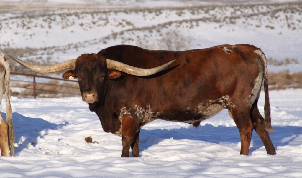 We are very happy to now be part owner of this bull. He is the total package of Horn, Color and Pedigree. Horn Showcase Champion in 2012 with a T2T of 74.125". This bull produces quiet, good looking calves with a lot of lateral horn. Check out his recent calves in his progeny section below. We really like them!