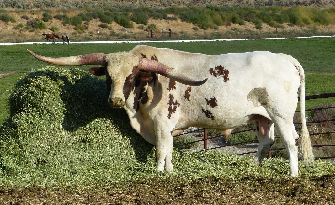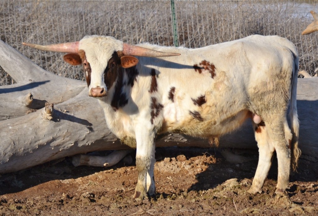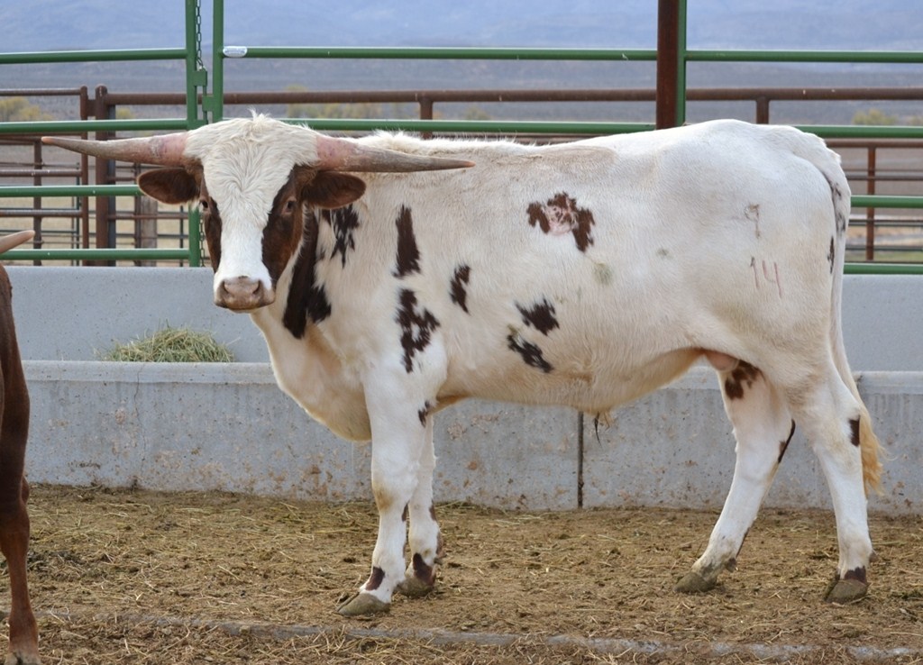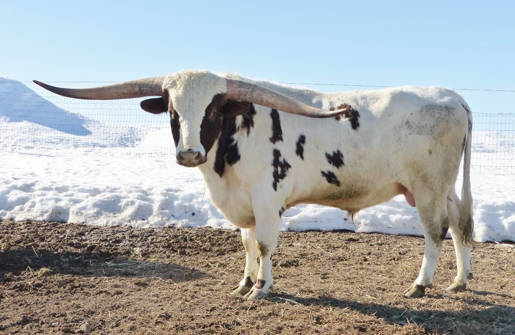 A son of the late great Cowboy Up Chex (who was a full brother to Cowboy Tuff Chex) out of a huge cow who is getting close to 90". Over 41" at 12 months old. Wow! Bronze Winner at the 2015 Horn Showcase. This bull is approaching a ton in size and throws mostly solid colored calves. His daughters are flat horned and big bodied.